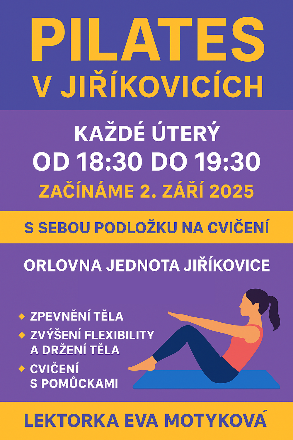 Pilates v Jiříkovicích každé úterý od 18:30 do 19:30. Lektorka - Eva Motyková.