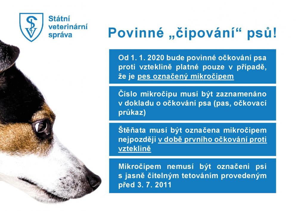 Povinně čipovat by se měli všichni psi v době prvního očkování proti vzteklině, tedy kolem půl roku věku zvířete. Svého psa můžete nechat čipovat již letos, není třeba čekat na žádné konkrétní datum. Povinné očkování psa proti vzteklině je od tohoto data platné, pouze pokud je pes takto označen. Sankce za nedodržení by se mohly pohybovat v rozmezí 20 – 100 tisíc Kč v závislosti na druhu provinění. Výjimkou je pouze pes, který byl označen čitelným tetování provedeným před 3. 7. 2011.