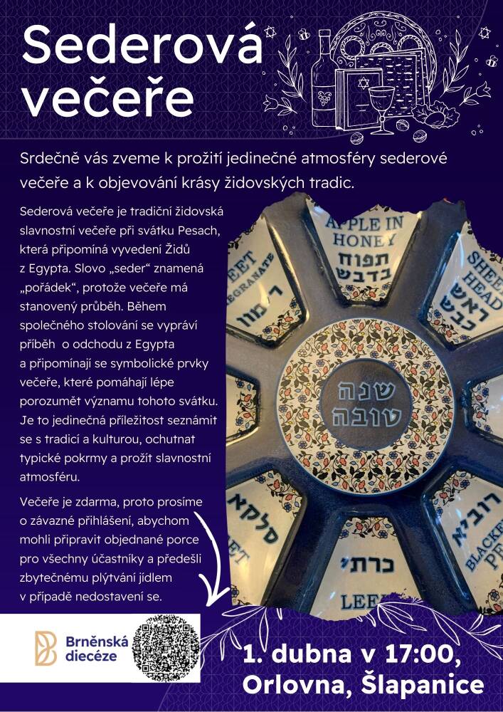 Součástí velikonočního období bude také sederová večeře, která přiblíží krásu židovských tradic. Nabídne jedinečnou atmosféru svátku Pesach, symbolické pokrmy i vyprávění o vyvedení Izraelitů z Egypta. Uskuteční se ve středu 1. dubna v 17:00 hodin v orlovně ve Šlapanicích.