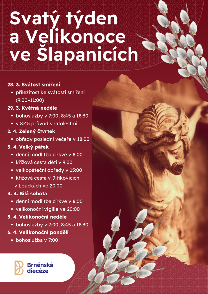 Velikonoce patří k nejvýznamnějším křesťanským svátkům v roce. Farnost Šlapanice zve všechny k jejich prožití prostřednictvím bohoslužeb a společných setkání.