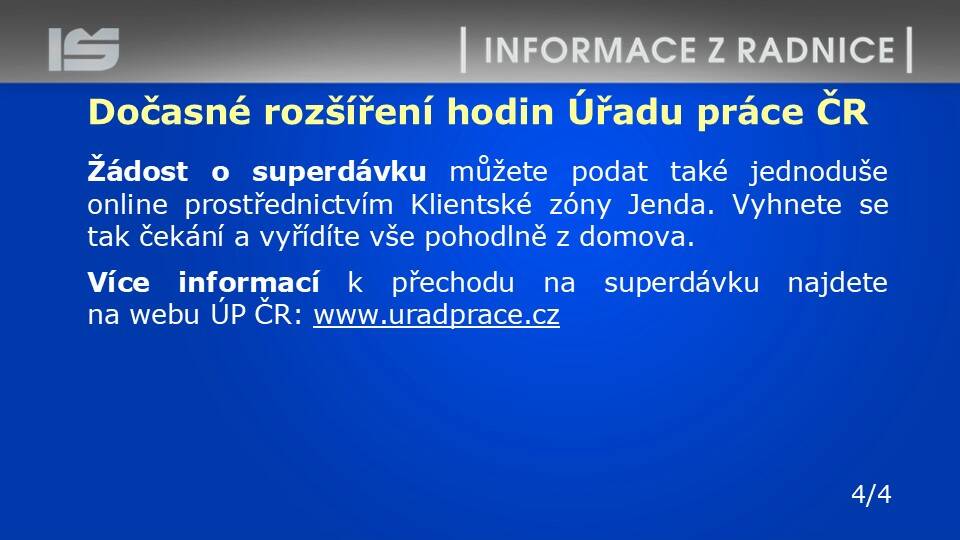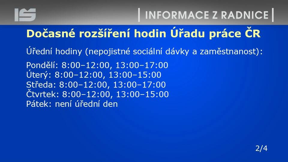 8.00 - 12.00 jsou na pracovišti ve Šlapanicích otevřeny pouze přepážky Odboru správních činností - občanské průkazy, cestovní doklady a evidence obyvatel.